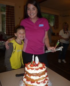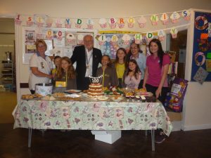 Celebration 100 took the form of a special party with the biggest ever strawberry and fresh cream cake (see below) as well as games, activities and singing. Arranged by the present ‘Brown Owl’ Sharon Winter the party saw several past ‘Brown Owls’ and other leaders, families and friends of the unit and one of the IW Council’s councillors for Ryde Cllr Charles Chapman attending.