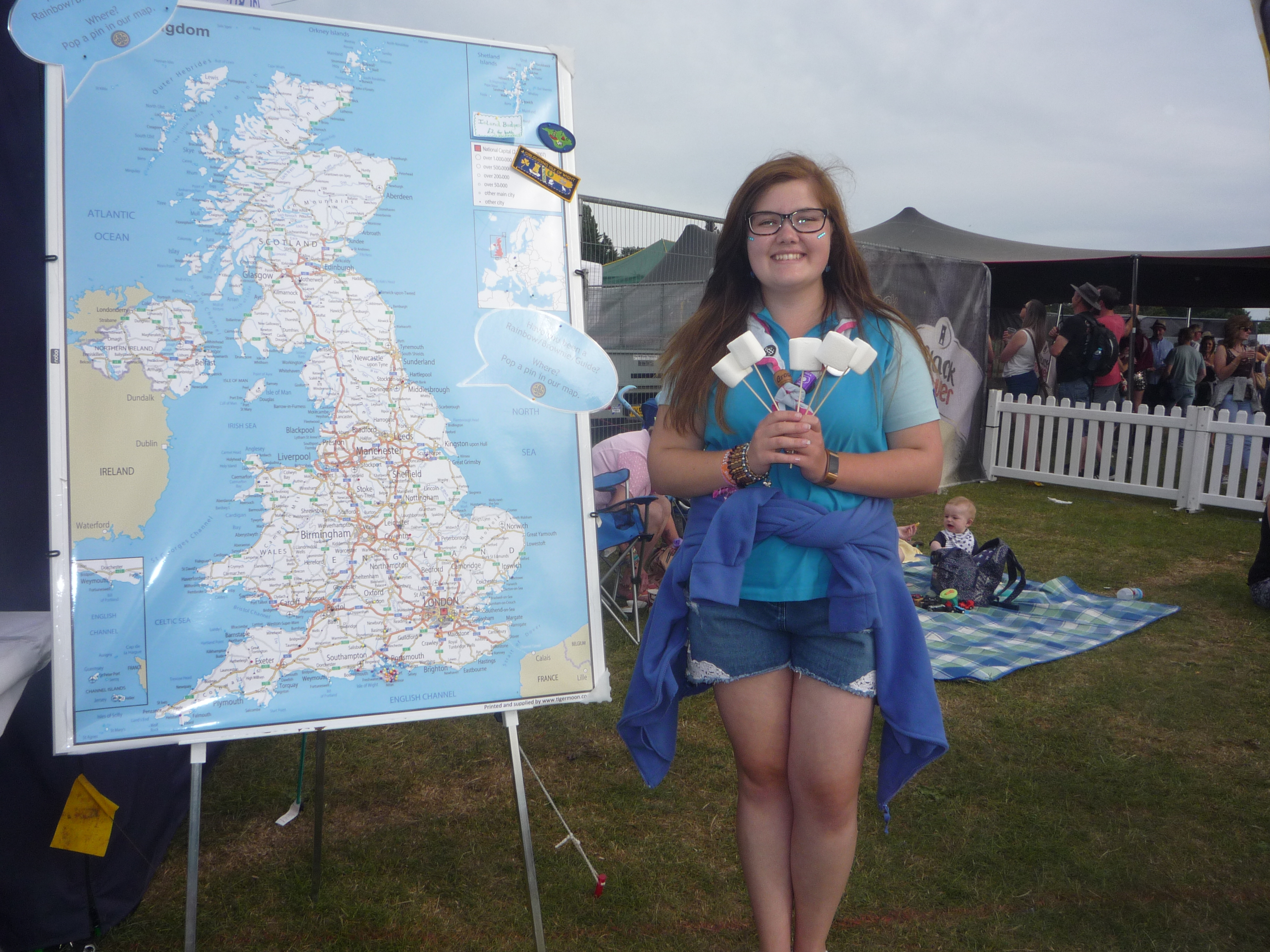As well as handing out these sweet treats Girlguiding IW members hosted hundreds to the stand who selected old and new Girlguiding badges, found a free gift in the lucky dip, purchased a much needed sunshade or pinned their special Girlguiding place on a large map. Of course the Isle of Wight proved the most popular spot for the pins with dozens of IW members visiting the stand. According to the map Aberdeen proved the furthest place from the festival site for UK visiting member but topping the furthest overall list were two Guides from Australia and one Girlscout from the USA.