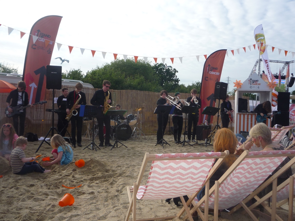 With the main charity of the IW Festival being ‘Stand Up To Cancer’ it was no surprise that this charity got some welcome support from the musicians of Carisbrooke College. Playing on the ‘Stand Up To Cancer’ beach for around an hour this local band, led by music teacher Ben Sampler was well received and whilst the band played children could enjoy the pleasures of sand castle building on this beach in a field on the banks of the River Medina!