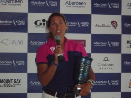 Regattas such as Cowes Week cost a lot to run and as well as the title sponsor Aberdeen Asset Management, other sponsors help to provide the money or goods for these large events. For adults there were wine tastings on the Parade and in Cowes Yacht Haven presented by one of the regatta’s sponsors. Laithwaite’s Wine was launched by Tony Laithwaite 45 years ago. Now a global company they have a large presence in Bordeaux. With a vineyard near Windsor Castle they will soon be offering ‘local‘ wines to Her Majesty the Queen. Operating 10 shops as well as on-line sales they were selected to be the official wine suppliers to AAM Cowes Week and Laithwaite’s Champagne was used to toast the winner of this year’s Ladies Day, Dee Caffari who learned her serious sailing at UKSA. As well as Dee being presented with the trophy made from Island glass she was presented with Laithwaite’s Champagne and a bottle of Mount Gay Black Barrel Rum. Shirley Robertson, Girlguiding IW Ambassador, hosted this presentation. Shirley had a busy week and was seen on her scooter getting from event to event. When it was mentioned to her that she had been seen scooter riding she replied ” You should have seen me on the scooter in my high heels!”