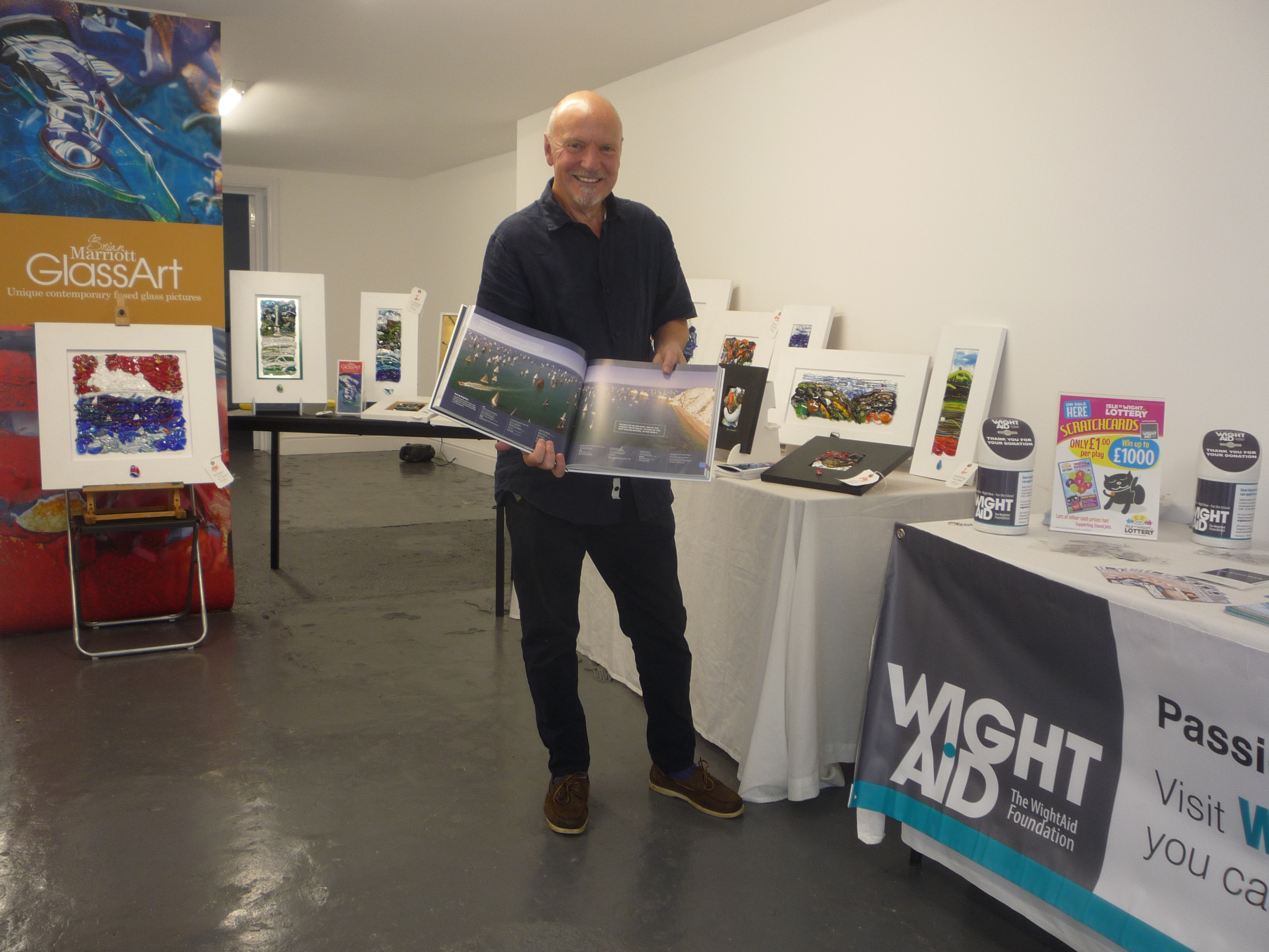 Open for Cowes Week an empty shop in Cowes High Street is in use by the Wight Aid Charity to raise public awareness of this local charity which supports other local charities by donating funds for projects. Recently launched The Wight Book was on sale as was the glass artwork by Brian Marriot, a trustee of Wight Aid.