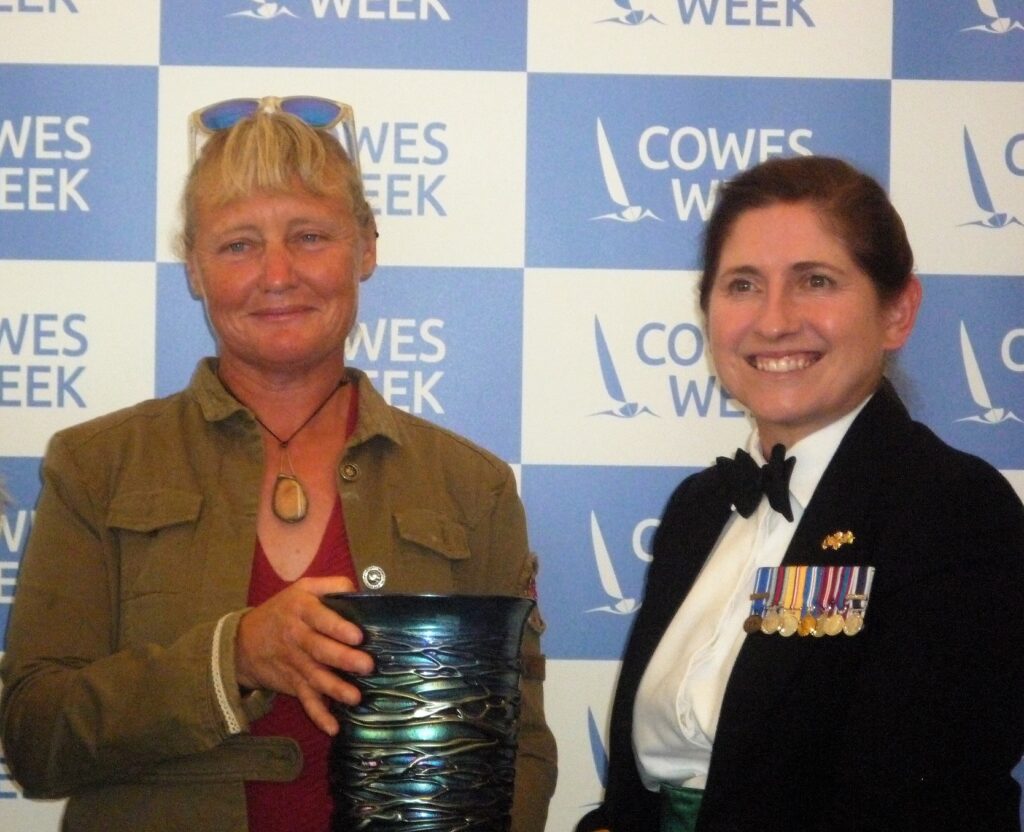Pip Hare solo round the World racing sailor was awarded the Cowes Week Women’s Day Trophy at a presentation in the RORC Clubhouse. This trophy recognises the outstanding contribution, commitment, and achievements of women in sailing. Pip received the trophy from Captain Catherine Jordan RN. Pip rose to fame in the 2020/21 Vendee Globe non-stop solo Round the World Race. Having started as an underdog in one of the oldest boats in the fleet, she out-performed many newer boats in this gruelling competition. The Women’s Day Trophy (previously The Ladies Day Trophy) was introduced in 2006. It champions the role of women in sailing and during Cowes Week more than one-third of competitors are female.