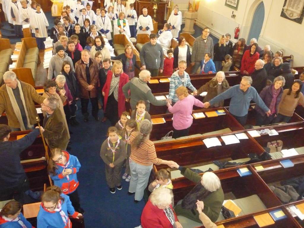 Themed on how a small seed, such as that sown by Robert and Agnes Baden Powell in 1910, can grow into a Worldwide movement of 10 million girls and young women, all the church congregation formed a human tree which filled the church. Everyone was also presented with a seed to enhance the message of how such a small item can grow into something much larger.