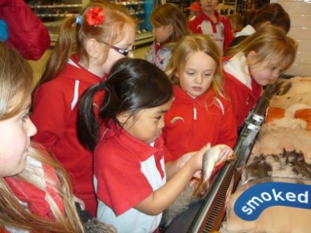 All the girls aged 5-7 really enjoyed working for this challenge part of which involved the study of different kinds of fish and shell fish. To enable the Rainbows to understand and see the various varieties of the species a visit was made to Sainsbury’s Newport where the first stop was the wet-fish counter.