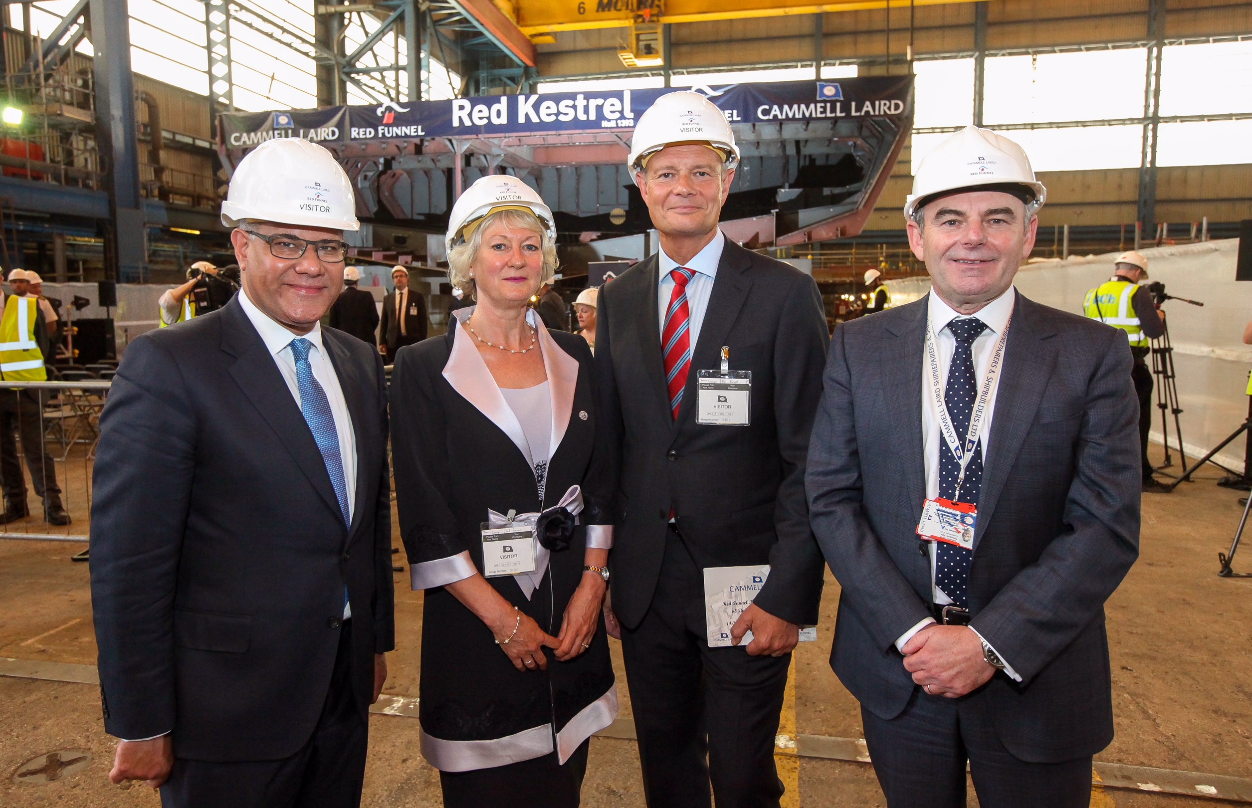 Karen George, wife of Red Funnel’s Chairman, had the honour of pushing the button to lay down the first section of the keel. She was accompanied by the Rt Hon Alok Sharma MP, Minister of State for Employment at Department of Work and Pensions; John Syvret CBE, CEO of Cammell Laird; and Kevin George, Chairman of Red Funnel Group. This milestone event was followed by a keynote address from the Minister of State and formed part of his visit to businesses in the North West of England.